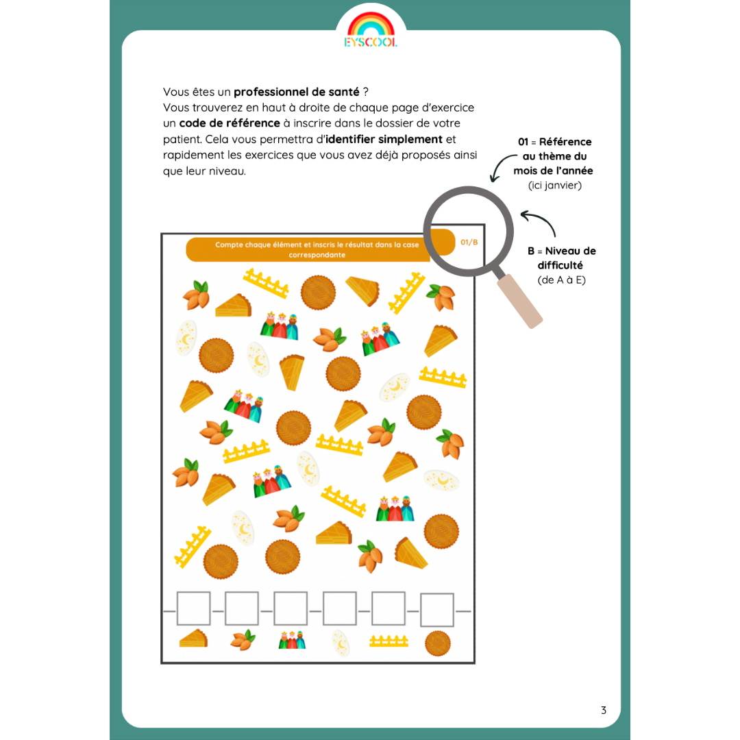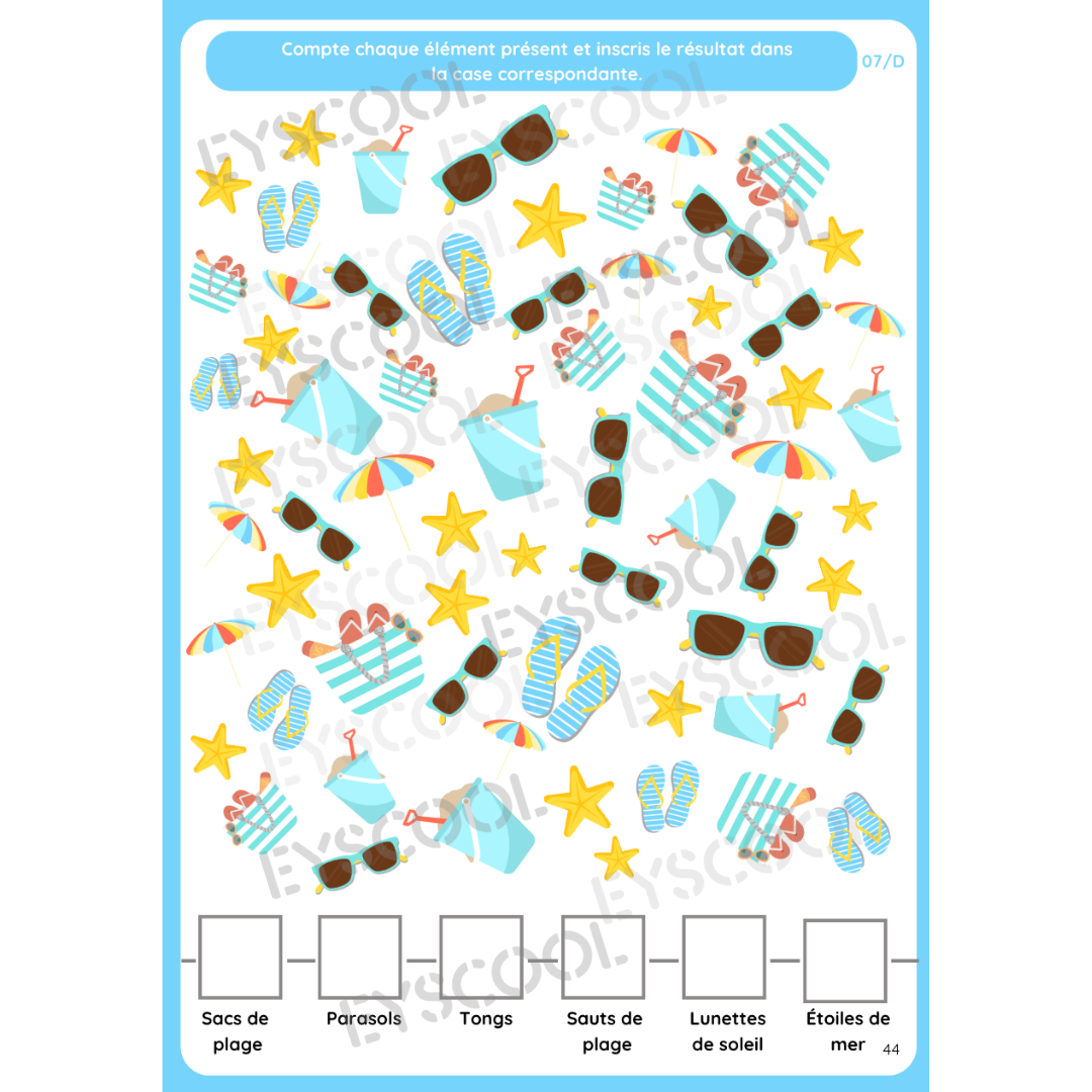 Il a été conçu de manière à proposer des exercices ludiques de dénombrement et de barrage, par thématique (Noël, carnaval, la plage, les sports d'hiver, la rentrée etc.)