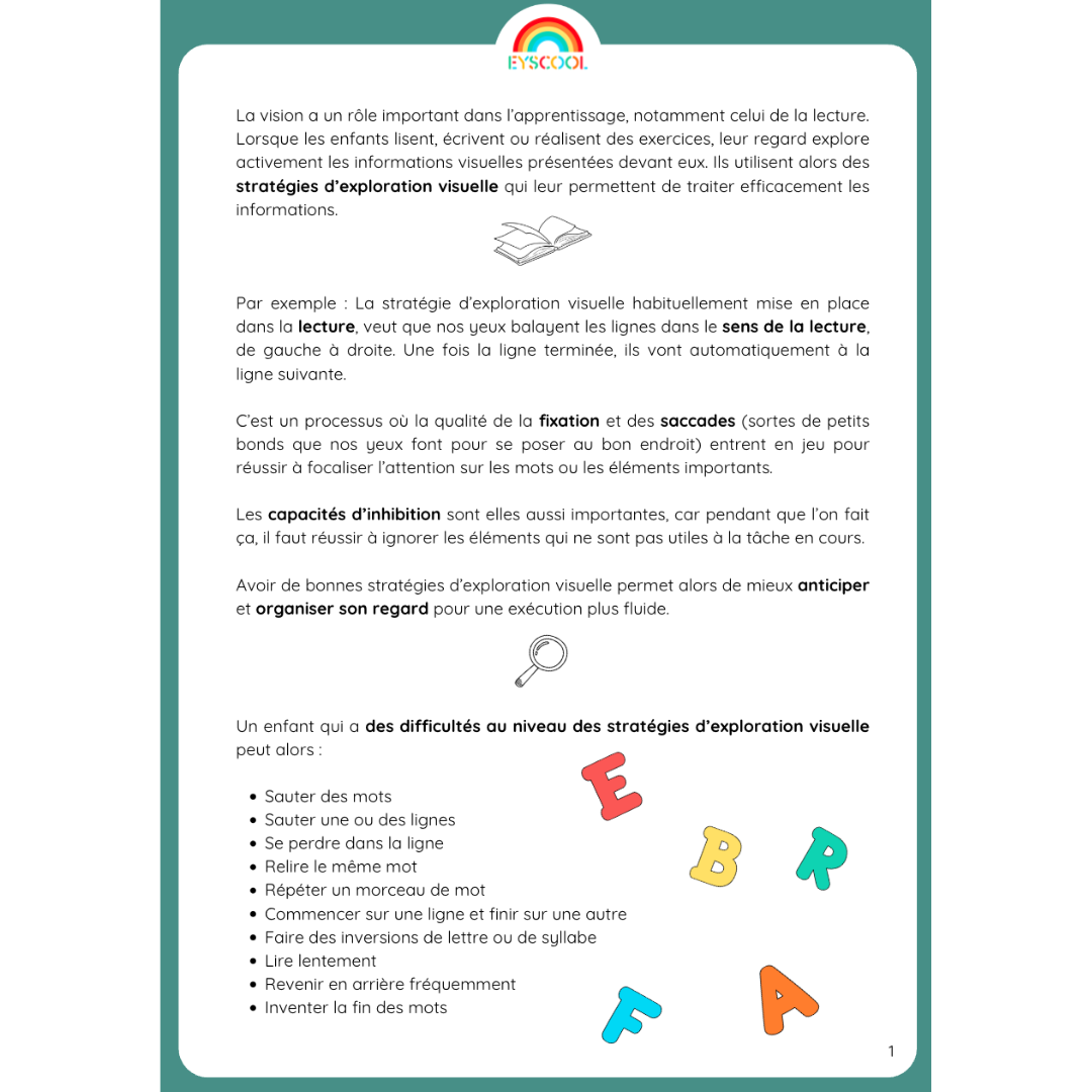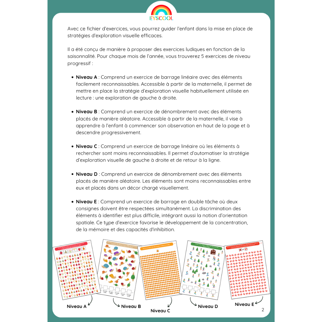 En utilisant ce fichier d'exercices, vous pourrez guider les enfants, de la grande section de maternelle jusqu'à l'école élémentaire et bien plus, dans l'acquisition de stratégies d'exploration visuelle efficaces ; les aidant ainsi à mieux anticiper et organiser leur regard.